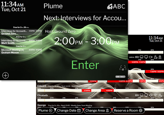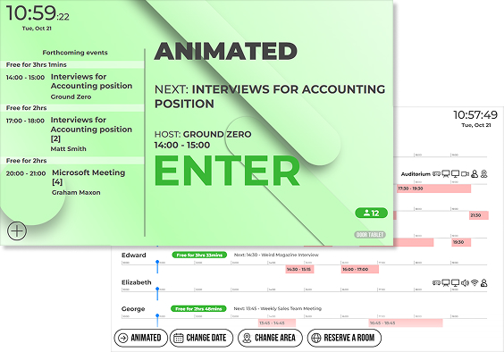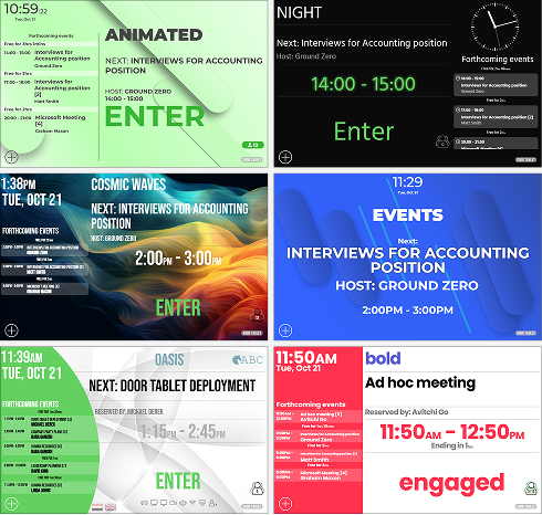 We're excited for you to see the templates we've cooked up for you, but don't forget, all the Door Tablet themes are fully customisable and can be set up to have any of the following options: translation into any of 50 languages on screen language switcher check-in deadline integration with sensors the ability to extend or terminate meetings booking from the tablet information on the number of attendants