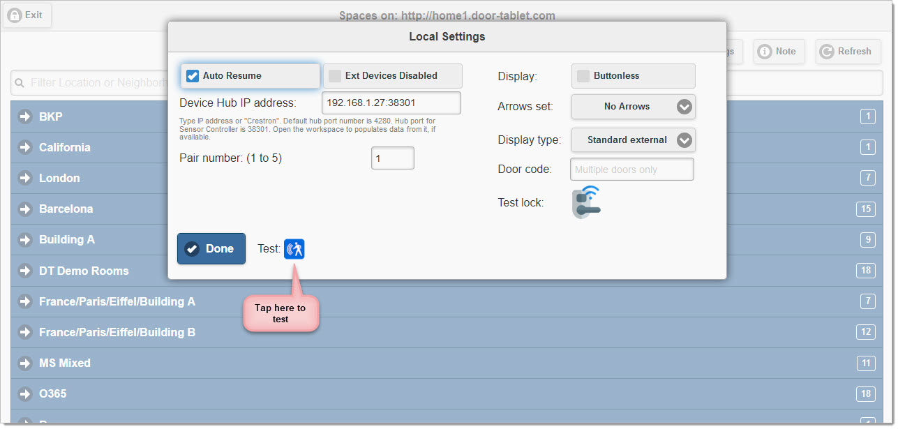 Open the room and exit it. You are now ready to test your configuration. Scroll up and tap on Local Settings: