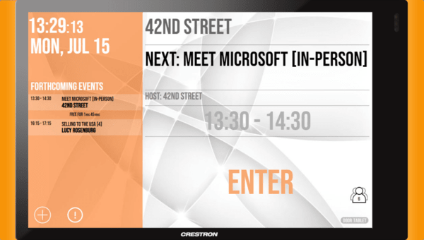 Door Tablet runs on Crestron displays that are placed outside your meeting spaces. Available with sensors and RFID options.