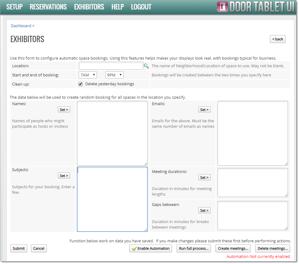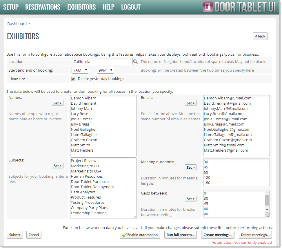 From V9.0.12 of Door Tablet, you can use the standard system in Exhibitions to provide a real sense of a busy meeting environment. The core of this functionality is the ability to make random bookings that look real. You will have full control over the features.