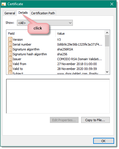 Open the Exchange server using a browser and click on the padlock, then "Certificate":