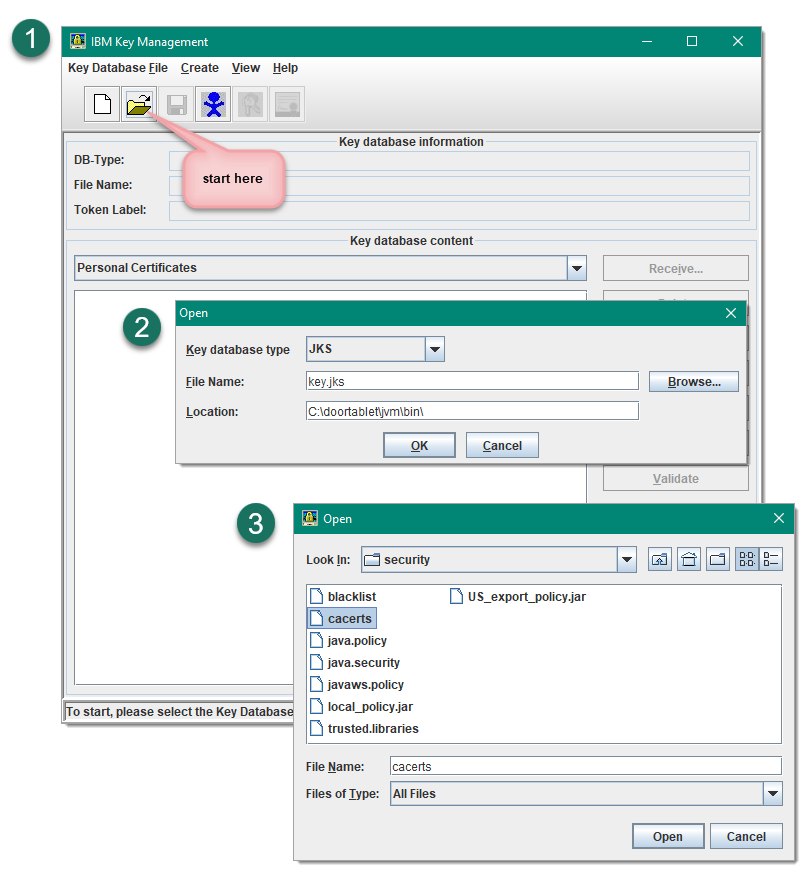 4. Browse to C:\Door Tablet\jvm\lib\security\cacerts. Note: you will have to view "All Files" to locate cacerts