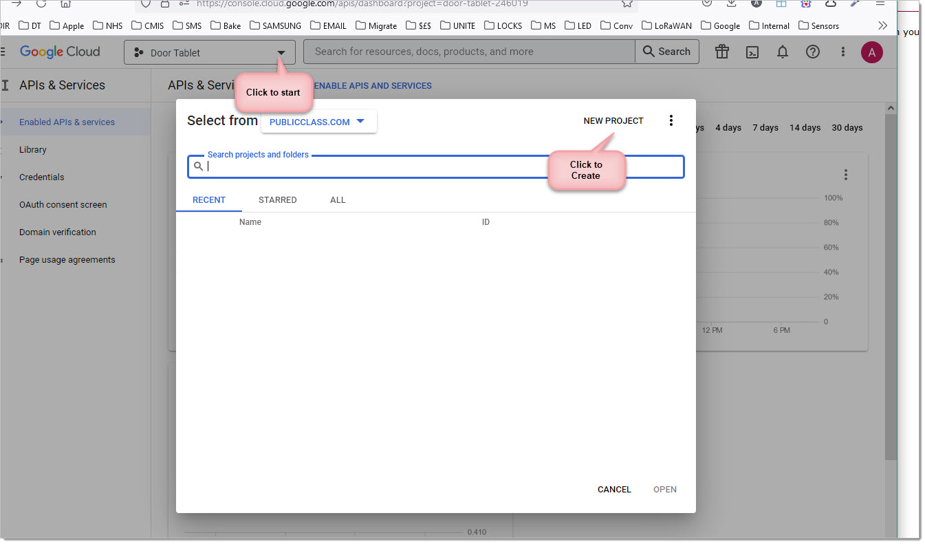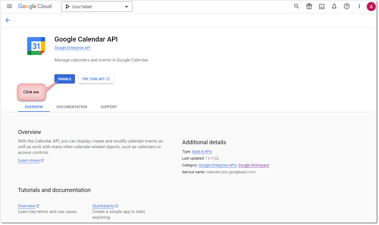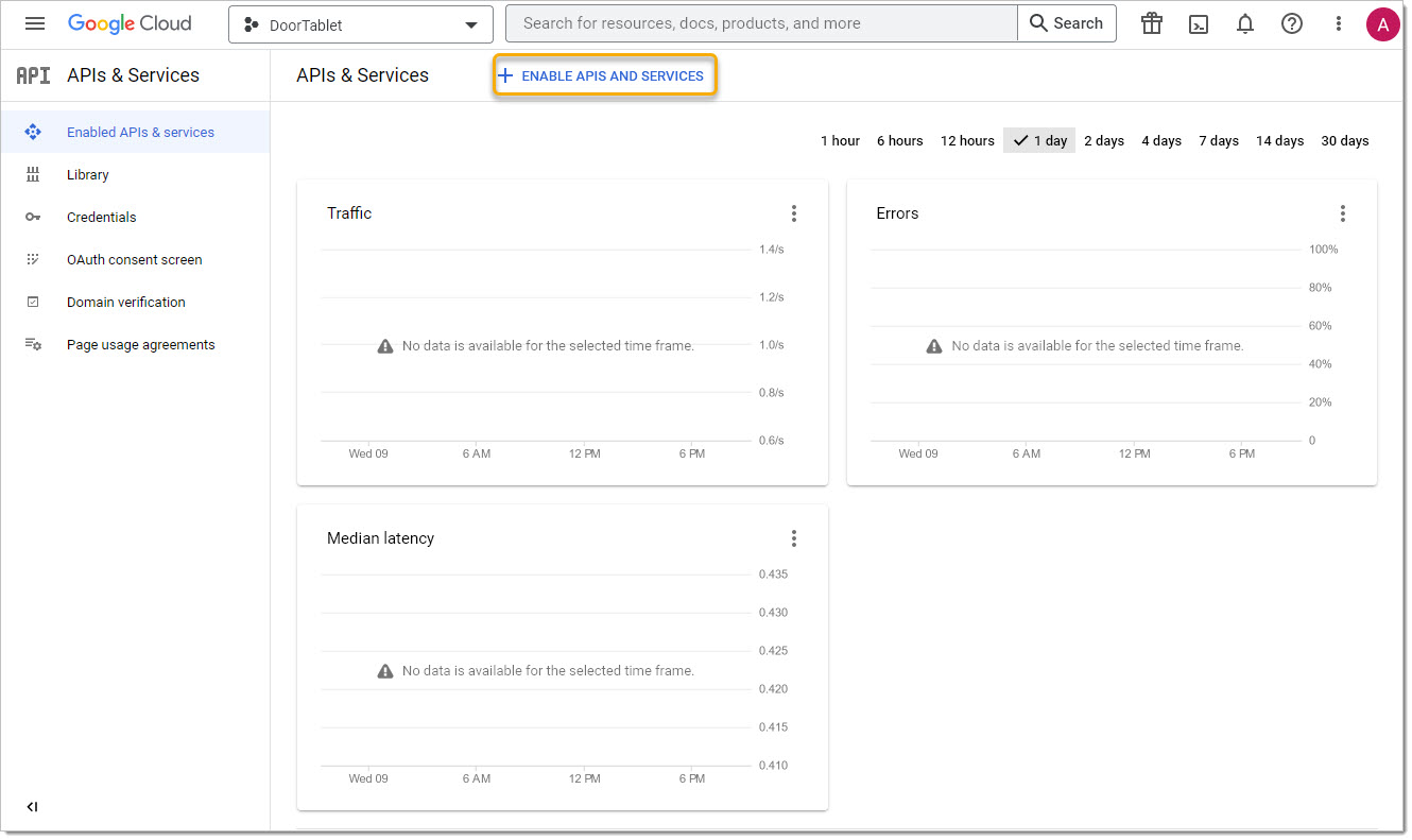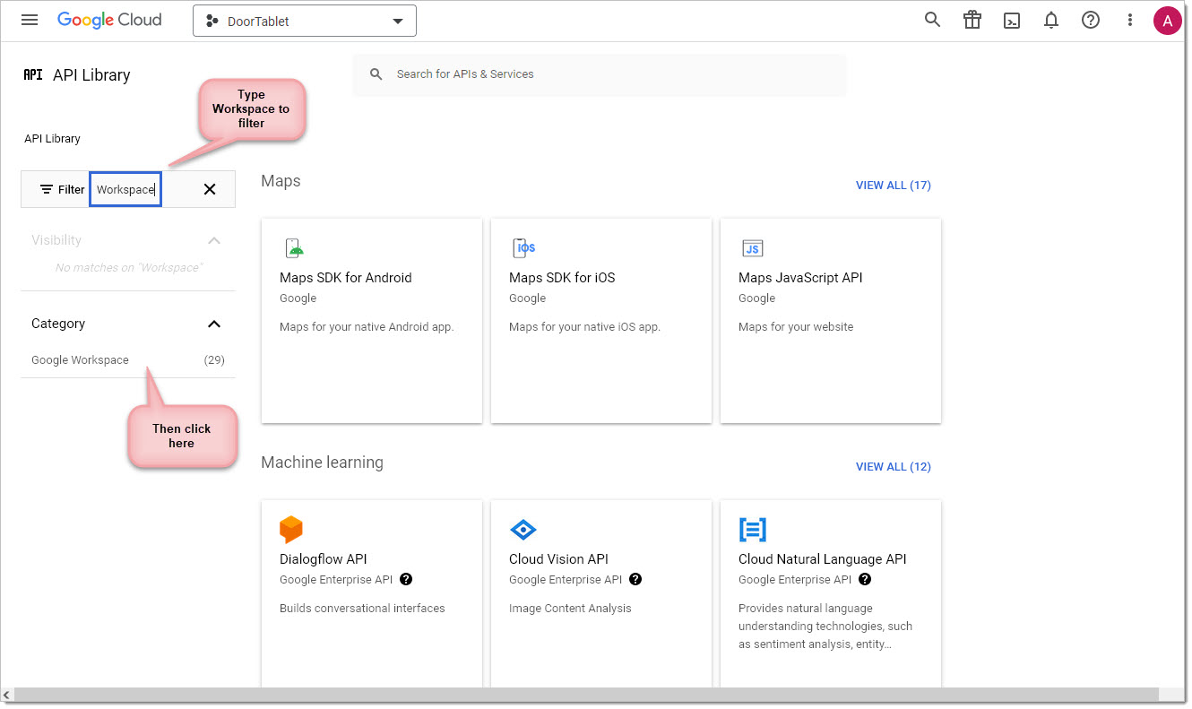 1. Creating a "Door Tablet" project in the Google Developers Console that will facilitate the connection between your Door Tablet server and the Google Workspace servers
