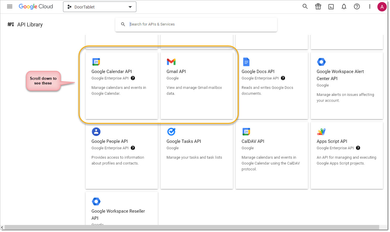 Enable API access for G Suite resources in Door Tablet by creating a project in the Google Developers Console and enabling the Calendar and Gmail APIs. Anonymousprnt::Y
