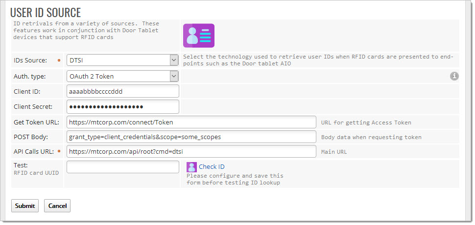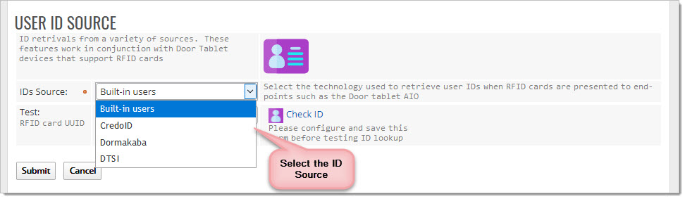 As you will see, the default ID Source is the Door Tablet built-in users. To use another source, further configuration is required. Current options: