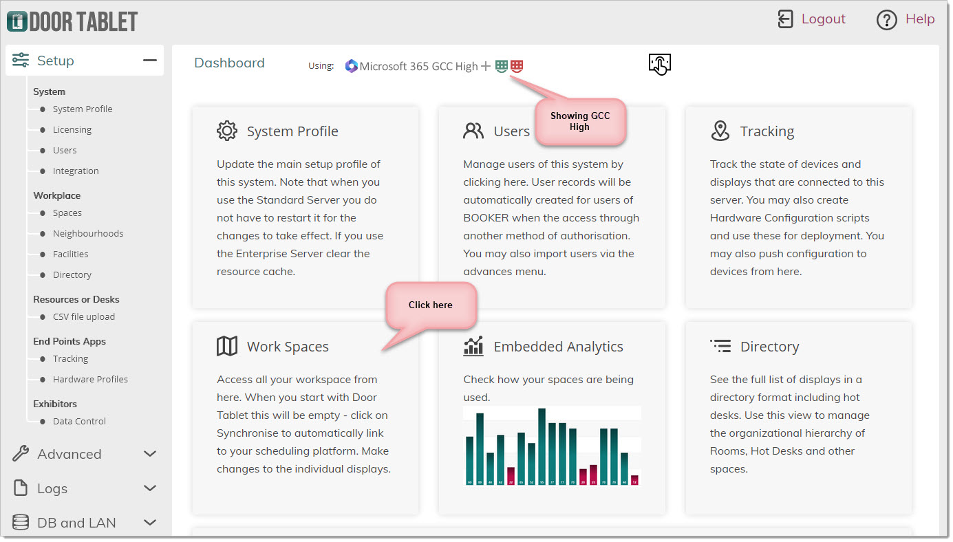 For GCC High instances, if Places API is enabled you will be able to "Synchronise" your rooms with Door Tablet.