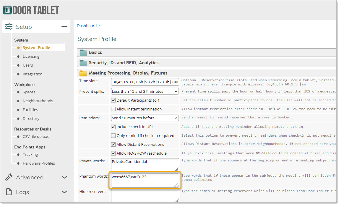 To set phantom words, open the system profile, add your phantom words, delimited by semi-colons. Phantom words adhere to a strict format but they may appear anywhere in the meeting subject. When booking a meeting from an end-point, phantom words will not be checked and the meeting will always show.