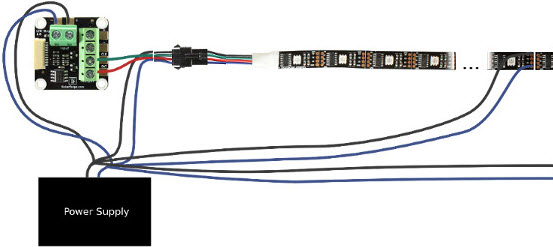 As described in the section above, the Bricklet supports LED strips and pixels with WS2801, WS2811, WS2812, SK6812 (NeoPixel RGB), SK6812RGBW (NeoPixel RGBW), LPD8806 and APA102 (DotStar) driver. The terminal labelled with "Output" has to be connected with the input of the first LED driver.