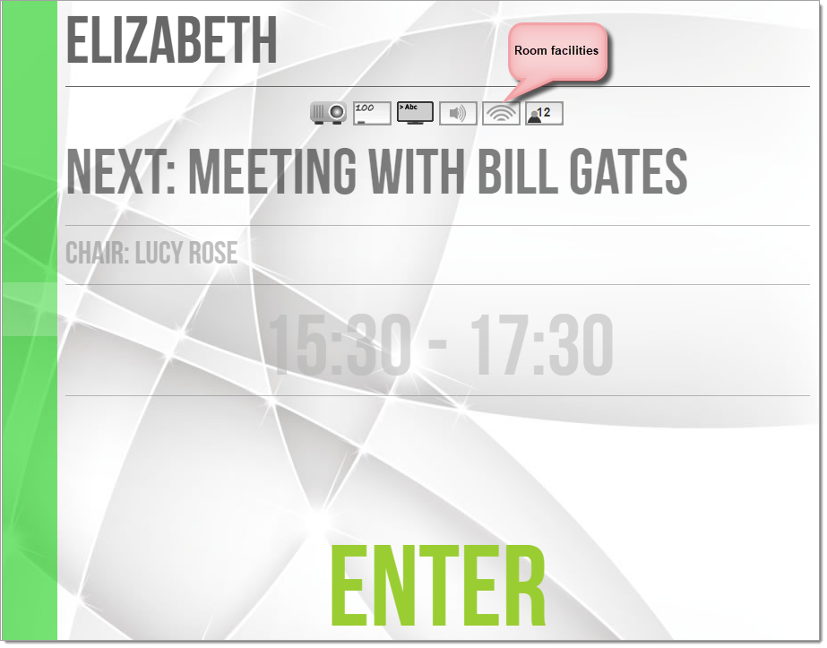 From version 4.2 of Door Tablet, you can indicate the kind of facilities available in each meeting space. These facilities are displayed as icons on:
