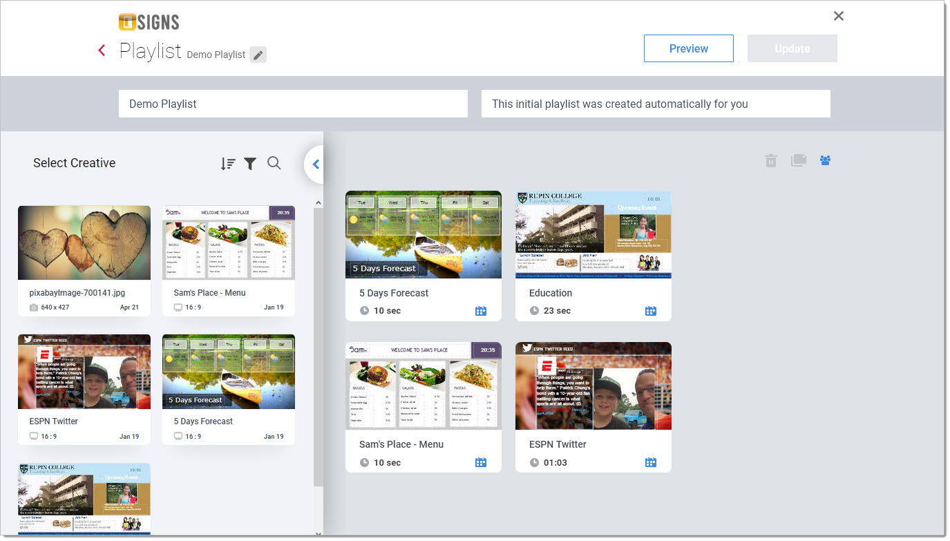 Once you create a Playlist you can drag Creatives into it, and set how long they play...