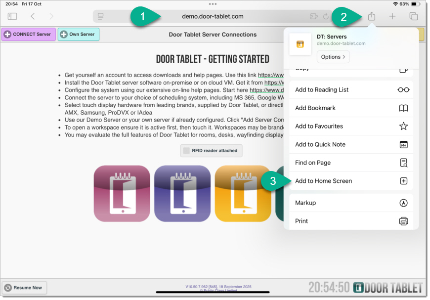 - Use Safari to open the Door Tablet server URL. See here for details