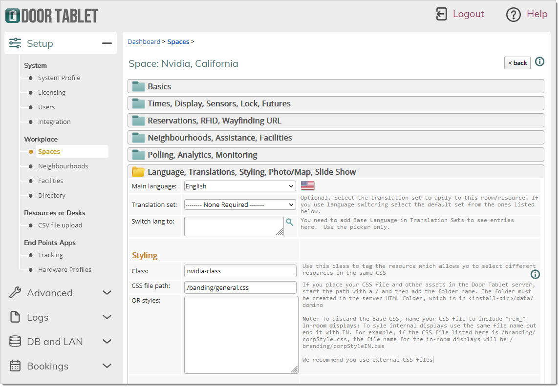 From Door Tablet V10.20.11 you can specify styles relevant to a particular space by referencing the class you specify. For example you can use this to change the name of room when you switching languages.