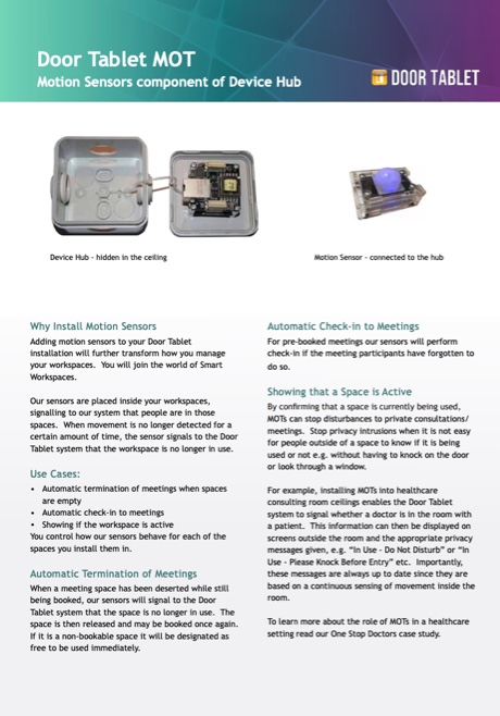 Door Tablet optimizes the use of clinic and therapy rooms, consulting rooms and business seminar rooms, making it the perfect solution for healthcare facilities. The integration of our sensors into Door Tablet's system for managing meeting room bookings solved room privacy issues for One Stop Doctors.